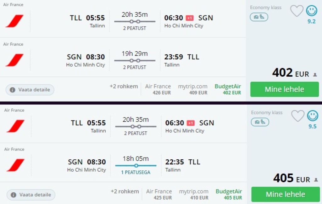 Air France pakub hetkel koostöös airBalticuga väga hea hinnaga lennupileteid sügiseks Tallinnast Vietnami. Edasi-tagasi lennupiletid on saadaval alates 402€ eest. Soodsa hinnaga lennupileteid leiab alates septembrist kuni detsembrini. Novembris on hinnad paarikümne euro võrra kallimad. Kõik meie poolt välja otsitud lennupiletid on kiirete ümberistumistega. Piletiteni jõudmiseks kliki näidiskuupäevadel allpool või kontrolli endale sobivaid lennukuupäevi läbi momondo.ee.