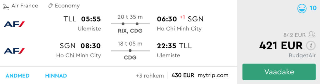 Hinnad on toodud reisides kahekesi. Üksi reisides on hinnad kuskil 5-10€ kallimad. Air France lennupiletite hinnad jäävad vahemikku 421-435€ ning Turkishi omad 461-480€.