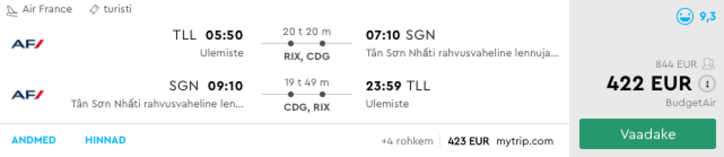 Air France pakub hetkel väga hea hinnaga lennupileteid Vietnami. Edasi-tagasi lennupiletid Tallinnast Ho Chi Minh Citysse on saadaval alates 422€ eest. Soodsa hinnaga lennupileteid leiab piiratud kuupäevadel novembris ning detsembris. Lennud on ümberistumistega Riias ning Pariisis. Piletiteni jõudmiseks kliki allpool olevatel näidiskuupäevadel või kontrolli endale sobivaid lennukuupäevi läbi Momondo.ee