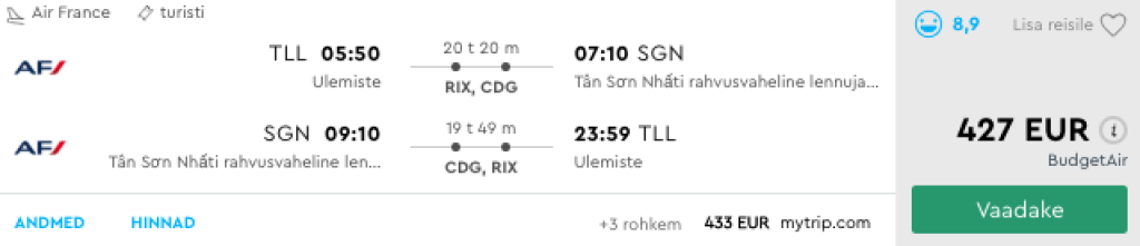 Air France koostöös airBaltivuga pakuvad hea hinnaga lennupileteid Tallinnast Vietnami. Edasi-tagasi lennupiletid Tallinnast Ho Chi Minh Citysse on saadaval alates 427€ eest. Soodsa hinnaga lennupileteid leiab piiratud kuupäevadel novembrist jaanuarini. Lennud on ümberistumistega Riias ning Pariisis. Piletiteni jõudmiseks kliki allpool olevatel näidiskuupäevadel või kontrolli endale sobivaid lennukuupäevi läbi Momondo.ee