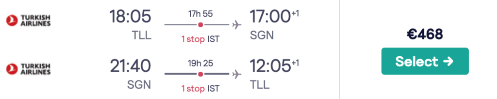 Turkish Airlines pakub hetkel väga hea hinnaga lennupileteid Tallinnast Vietnami. Mõlemal suunal ühe kiire ümberistumisega lennupiletid Tallinnast Ho Chi Minh Citysse on saadaval alates 468€ eest. Lennupiletite hinna sees on nii äraantav pagas kui toitlustamine Turkish Airlinesi pardal. Soodsa hinnaga lennupiletite saadavust leiab alates septembri algusest kuni 2021 juunini välja (välja arvatud dets keskpaik-veebruari lõpp). Parima hinnaga lennupiletid leiad üles läbi Skyscanneri
