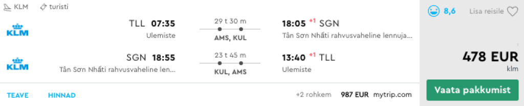 Air France/KLM pakuvad hetkel väga hea hinnaga lennupileteid Vietnami. Edasi-tagasi lennupiletid Tallinnast Ho Chi Minh Citysse on saadaval alates 478€ eest. Soodsa hinnaga lennupileteid leiab alates septembri keskpaigast kuni 2020 märtsi lõpuni. Kõige soodsamate lennupiletite puhul toimuvad lennud üle Amsterdami ning sel juhul on minnes kuskil 10-11h ümberistumine, mis annab võimaluse ka minnes Amsterdamiga tutvumiseks. Tagasilennud on kiirete ümberistumistega. Piletiteni jõudmiseks kliki allpool olevatel näidiskuupäevadel või kontrolli endale sobivaid lennukuupäevi läbi Momondo.ee