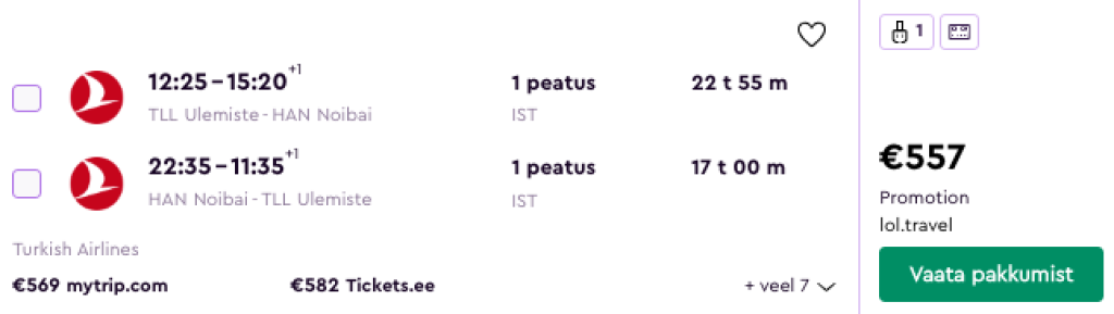 Turkish Airlines pakub hetkel väga hea hinnaga lennupileteid Vietnamisse. Ühe ümberistumsiega edasi-tagasi lennupiletid Tallinnast Hanoisse on saadaval alates 557€ eest ning hea hinnaga lennupileteid leiab reisimaks Vietnamisse vahemikus august kuni oktoober. Lennupiletite hinna sees on nii äraantav pagas kui toitlustamine lennukite pardal. Miinuseks (või siis boonuseks) on tulenevalt lennuplaanist minnes päevasel ajal kuskil 10h ümberistumine Istanbulis, mis annab võimaluse ka osa saada Turkish Airlinesi poolt pakutavast tasuta linnatuurist. Lennupiletite ostmiseks kliki allpool olevatel näidiskuupäevadel või sisesta need Momondosse