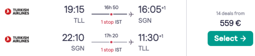 Turkish Airlines pakub hetkel suurepärase hinnaga lennupileteid Vietnamisse. Ühe kiire ümberistumsiega edasi-tagasi lennupiletid Tallinnast Ho Chi Minh Citysse on saadaval alates 559€ eest ning hea hinnaga lennupileteid leiab alates märtsist kuni juunini. Lennupiletite hinna sees on nii äraantav pagas kui toitlustamine lennufirma pardal. Lennupiletite ostmiseks kliki allpool olevatel näidiskuupäevadel või sisesta need Skyscannerisse.