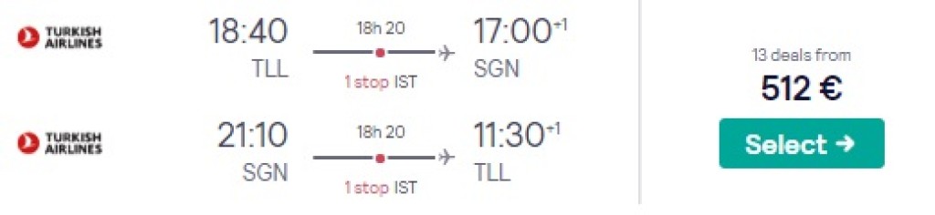 Turkish Airlines pakub hetkel hea hinnaga lennupileteid talveks Tallinnast Vietnami. Edasi-tagasi lennupiletid Tallinnast Ho Chi Minh Citysse või Hanoisse on saadaval al 512€ eest. Soodsa hinnaga lennupileteid leiab alates novembri lõpust kuni 2020 aasta juuni alguseni välja. Lennud mõlemal suunal ühe ümberistumisega Istanbulis ning hinnas sisaldub äraantav pagas. Soodsate lennupiletite ostmiseks kliki näidiskuupäevadel või kontrolli endale sobivaid lennukuupäevi läbi Skyscanneri