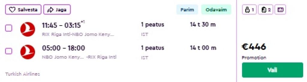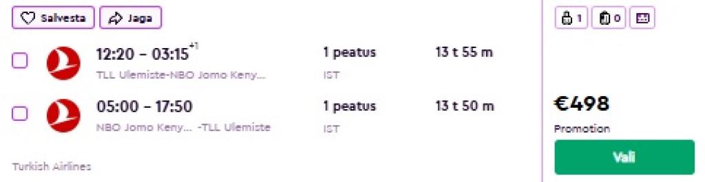 Turkish Airlines pakub suurepärase hinnaga lennupileteid Keeniasse. Ühe kiire ümberistumisega edasi-tagasi lennupiletid Tallinnast või Riiast Nairobisse on saadaval alates 446€ eest.