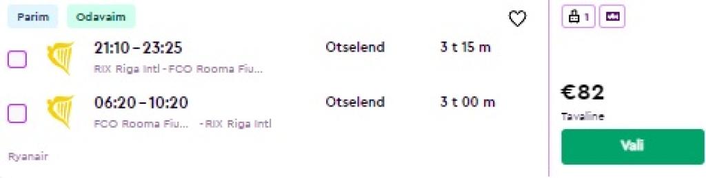 Odavlennufirma Ryanair pakub hetkel soodsa hinnaga lennupileteid Rooma. Edasi-tagasi lennupiletid otselendudele Tallinnast ja Riiast on saadaval alates 82€ eest. Piletiteni jõudmiseks kliki allpool olevatel näidiskuupäevadel või otsi endale sobivaid lennupileteid läbi Momondo.ee.