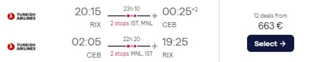 Turkish Airlines pakub hetkel soodsa hinnaga lennupileteid talveks Filipiinidele. Edasi-tagasi lennupiletid Riiast Cebusse on saadaval al 663€ eest ning ohtralt hea hinnaga lennupileteid leiab veebruarist aprillini. Lennupiletite hinnas sisaldub ka äraantav pagas. Lennupiletite ostmiseks kliki allolevatel lennukuupäevadel või kontrolli endale sobivaid kuupäevi skyscanneri.