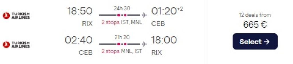 Turkish Airlines pakub hetkel soodsa hinnaga lennupileteid talveks Filipiinidele. Edasi-tagasi lennupiletid Riiast Cebusse on saadaval al 665€ eest ning ohtralt hea hinnaga lennupileteid leiab veebruarist aprillini. Lennupiletite hinnas sisaldub ka äraantav pagas. Lennupiletite ostmiseks kliki allolevatel lennukuupäevadel või kontrolli endale sobivaid kuupäevi skyscanneri.