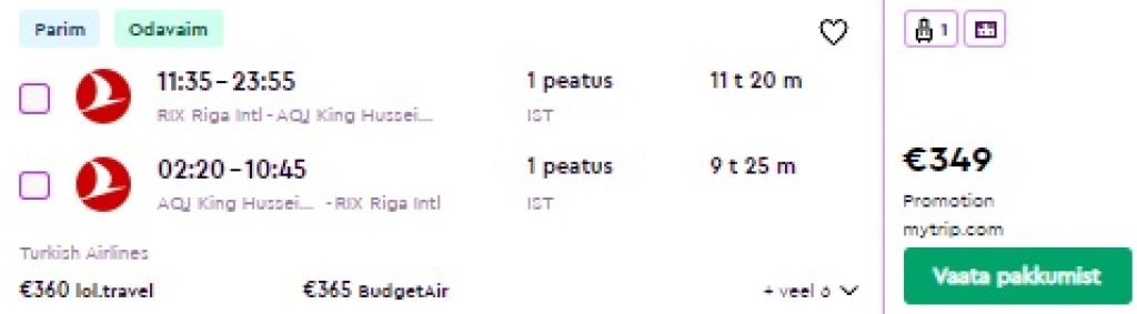 Hetkel võid leida väga hea hinnaga lennupileteid talveks Punase mere äärsesse Jordaaniasse. Edasi-tagasi lennupiletid Riiast Aqabasse on saadaval alates 349€ eest. Lennupiletite hinnas sisaldub ka äraantav pagas. Piletiteni jõudmiseks kliki allolevatel näidiskuupäevadel või kontrolli endale sobivaid kuupäevi läbi Momondo.ee.