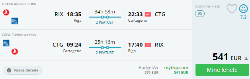 Lennufirma Turkish Airlines koostöös Avianca ning Copaga pakuvad hetkel väga hea hinnaga lennupileteid Riiast Kolumbiasse. Edasi-tagasi lennupiletid Riiast Cartagenasse on saadaval alates 541€ eest. Lendudel on mõlemal suunal kaks ümberistumist, mõningatel lennukuupäevadel on võimalik minnes veeta u 10h Panama Citys või Bogotas. Piletite ostmiseks kliki allolevatel näidiskuupäevadel või kontrolli endale sobivaid lennukuupäevi läbi [momondo](http://tc.tradetracker.net/?c=28199&m=12&a=292481&u=%2Fflightsearch%2F%3FSearch%3Dtrue%26TripType%3D2%26SegNo%3D2%26SO0%3DRIX%26SD0%3DCTG%26SDP0%3D09-04-2019%26SO1%3DCTG%26SD1%3DRIX%26SDP1%3D26-04-2019%26AD%3D1%26TK%3DECO%26DO%3Dfalse%26NA%3Dfalse%26currency%3DEUR). _Tutvu kindlasti ka soodsate lennupiletitega Cartagenast San Andrese saarele pakkumise lõpuosas!_HotellidKui otsid soodsa hinnaga öömaja, siis soovitame parima ülevaate ja hinna saamiseks kasutada hotellihindade võrdlusportaali Hotelscombined.ee.