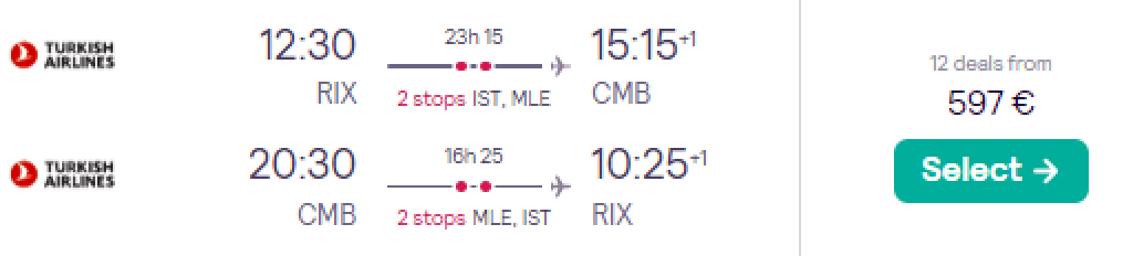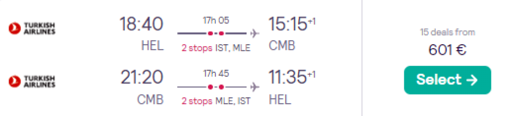 Turkish Airlines pakub hetkel väga hea hinnaga lennupileteid Sri Lankale. Edasi-tagasi lennupiletid Riiast või Helsingist Colombosse on saadaval alates 597€ eest ning soodsa hinnaga lennupileteid leiab veebruaris-märtsis. Lennupiletite hinna sees on nii äraantav pagas kui toitlustamine lennukite pardal. Parima hinnaga lennupiletid leiad üles läbi Skyscanneri.