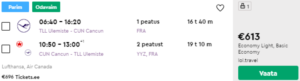 Lufthansa koostöös Air Canadaga pakuvad hetkel soodsa hinnaga lennupileteid talveks Mehhikosse. Edasi-tagasi Lennupiletid Tallinnast Cancuni on saadaval alates 613€ eest. Hea hinnaga lennupileteid leiab jaanuaris-veebruaris. Endale sobivaid lennukuupäevi kontrolli läbi Momondo.ee.