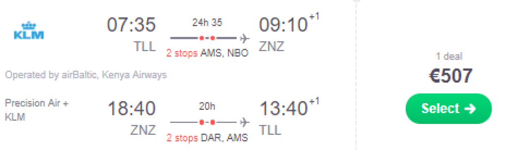 Hetkel on saadaval hea hinnaga lennupiletid talveks Sansibarile! Edasi-tagasi lennupiletid Tallinnast on saadaval alates 507€ eest ning valikus on soodsaid lennupileteid jaanuarist märtsini. Kõikidel väljaotsitud näidiskuupäevadel eksisteerivad lennud mõlemal suunal kahe kiire ümberistumisega. Soodsate lennupiletite ostmiseks kliki näidiskuupäevadel või kontrolli endale sobivaid lennukuupäevi läbi skyscanneri