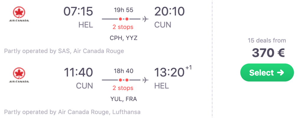 Star Alliance lennufirmad pakuvad hetkel suurepärase hinnaga lennupileteid Helsingist Mehhikosse. Edasi-tagasi lennupiletid Yucatani poolsaarel asuvasse Cancuni on saadaval alates 368€ eest. Lennupiletite hinna sees on ka äraantav pagas! Tõime allpool välja valiku lennukuupäevadest kuskil kahenädalasteks reisideks, soodsa hinnaga lennupileteid leiab ka teisteks kuupäevadeks. Parima hinnaga lennupiletid leiad üles läbi Skyscanneri