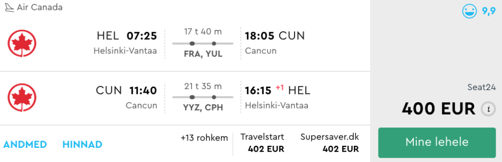 Star Alliance lennufirmad Air Canada, Lufthansa ja United pakuvad hetkel väga hea hinnaga lennupileteid Helsingist Mehhiko kuurortlinna Cancuni. Soodsaimad edasi-tagasi lennupiletid leiab üles vaid 400€ eest. Saadavus lennupiletitele hinnavahemikus 400-500€ on päris hea jaanuarist kuni aprilli alguseni. Toome allpool välja vaid mõned näidiskuupäevad, saadavust on ka teistel kuupäevadel! Parima hinnaga lennupiletid leiad üles läbi Momondo.ee