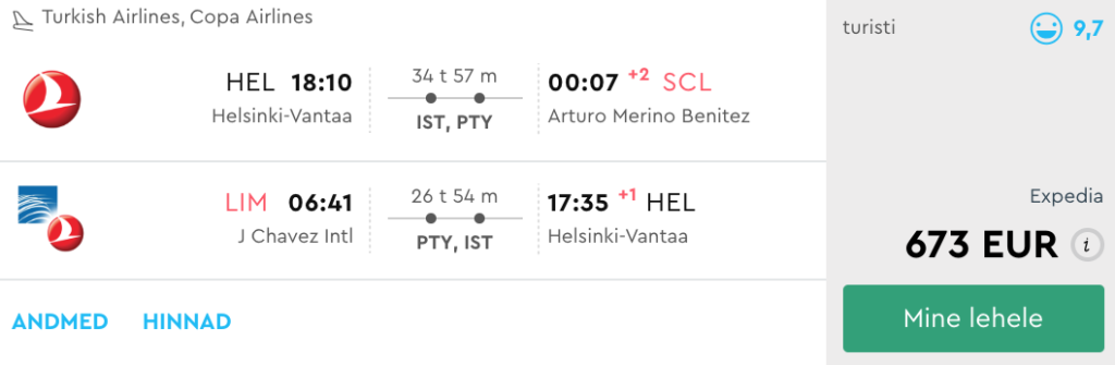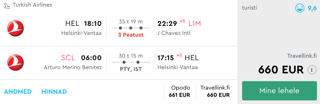 Turkish Airlines koostöös oma partnerite Copa Airlinesi ning LATAMiga pakuvad hetkel väga hea hinnaga lennupileteid Helsingist Tšiili pealinna Santiagosse ning Peruu pealinna Limasse. Edasi- tagasi lennupiletite hinnad on saadaval alates 613€ eest. Saadavust leiab alates veebruarist kuni aprilli lõpuni.