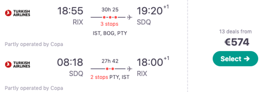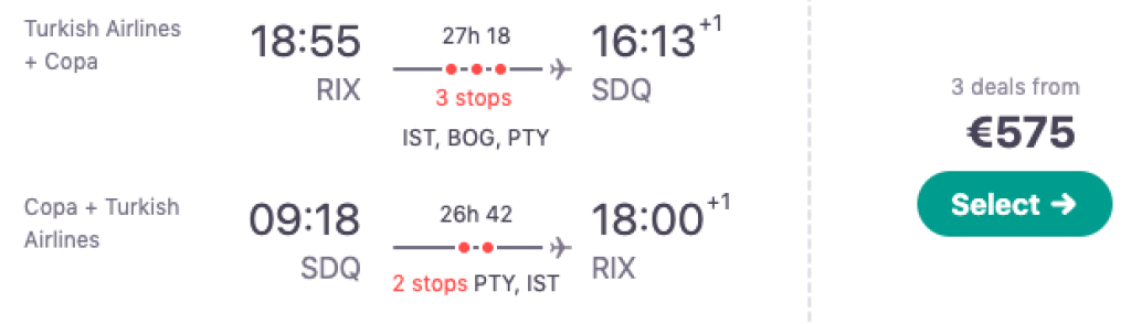 Turkish Airlines koostöös Copa Airlinesiga pakuvad hetkel soodsaid lennupileteid talveks Dominikaani Vabariiki. Edasi-tagasi lennupileteid Riiast Santo Domingosse leiab üles alates 574€ eest. Hea hinnaga lennupileteid leiab puhkamaks Dominikaani Vabariigis talvel. Tegemist pole kindlasti kõige mugavamate ümberistumistega lendudega, aga saadavus ja hind on head ning lennupiletite hinna sees on nii äraantav pagas kui toitlustamine lennufirmade pardal. Tutvu saadaolevate lennukuupäevadega allpool või kontrolli endale sobivaid lennukuupäevi läbi Skyscanneri