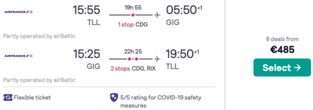 KLM/Air France pakuvad hetkel suurepärase hinnaga lennupileteid Tallinnast Brasiiliasse. Soodsaimad edasi-tagasi lennupiletid Tallinnast Rio de Janeirosse ning São Paulosse on saadaval alates 473€ eest ning saadavust leiab alates augustist kuni 2022 aasta aprillini. Olenevalt lennukuupäevadest on lendudel 1-2 ümberistumist. Tõime allpool välja mõned näidiskuupäevad, saadavust leiab ka teisteks kuupäevadeks. Parima hinnaga lennupiletid leiab üles läbi Skyscanneri