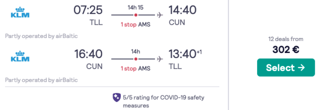 KLM/Air France koostöös partnerlennufirmadega pakuvad jätkuvalt suurepärase hinnaga lennupileteid Tallinnast Yucatani poolsaarele, Cancuni. Võrreldes varasemalt välja toodud näidiskuupäevadega on tulnud juurde ka teisi kuupäevi. Parima hinnaga lennupiletid leiad üles läbi Skyscanneri aga meie soovitus on minna KLM.com ja soetada lennupiletid otse lennufirmalt vaid paarikümne euro võrra kallimalt. Soodsa hinnaga lennupileteid leiab nii sügiseks kui talveks.