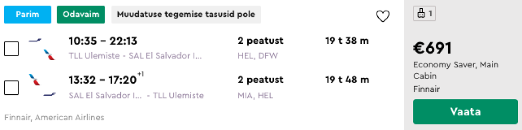 Finnair koostöös American Airlinesiga pakuvad hetkel atraktiivse hinnaga lennupileteid talveks El Salvadori. Edasi-tagasi lennupiletid Tallinnast on saadaval alates 691€ eest ning soodsa hinnaga lennupileteid leiab jaanuaris ja veebruaris. Lennud on mõlemal suunal kahe mugava ümberistumisega (Helsingis ja Dallases/Miamis). Lennupiletite hinnas sisaldub nii äraantav pagas, kui ka toitlustamine lennukite pardal. Parima hinnaga lennupiletid leiad üles läbi Momondo.ee või kliki allolevatel näidiskuupäevadel.