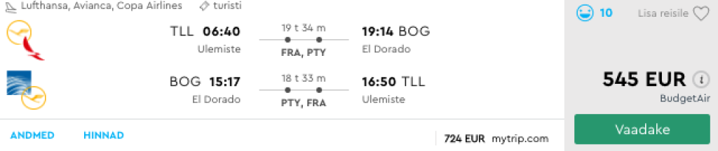 Euroopa parim lennufirma Lufhtansa koostöös Avianca ja Copaga pakuvad hetkel suurepärase hinnaga lennupileteid Tallinnast Kolumbiasse. Soodsaimad edasi-tagasi lennupiletid Tallinnast Kolumbia pealinna Bogotasse on saadaval vaid 545€ eest. Tõime allpool välja enamjaolt lennupiletid kuskil kahenädalaste reiside jaoks. Soodsa hinnaga lennupileteid leiab ka teistel kuupäevadel ning parima hinnaga lennupiletid leiad üles otsides läbi Momondo.ee