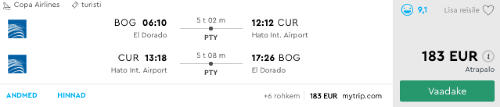 Bogota-Curacao-Bogota 183€Hollandile kuuluvale Curacaole ning ka Arubale (IATA kood AUA) pakub COPA edasi-tagasi lennupileteid Bogotast 183€ eest.
