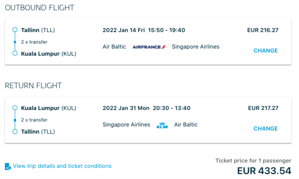 KLM/Air France koostöös airBalticu ning pakuvad hetkel atraktiivse hinnaga lennupileteid sügiseks Tallinnast Malaisiasse. Edasi-tagasi lennupiletid Tallinnast Kuala Lumpurisse on saadaval alates 407€ eest ning saadavust leiab juba alates suvest kuni 2022 aasta märtsini välja. Toome allpool välja näidiskuupäevad talveks, kuna hetkel pole veel teada kunas Malaisia oma piirid turistidele avab. Lendudel on olenevalt kuupäevadest 1-2 ümberistumist. Piletiteni jõudmiseks kliki allolevatel näidiskuupäevadel või kontrolli endale sobivaid kuupäevi läbi KLMi kodulehekülje
