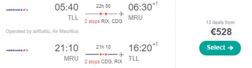 KLM/AF koostöös airBalticu ning Finnairiga pakuvad hetkel suurepärase hinnaga lennupileteid talveks ja kevadeks Mauritiusele. Soodsaimad edasi-tagasi lennupiletid Tallinnast Mauritiusele leiab üles alates 528€ eest ning hea hinnaga lennupileteid leiab detsembrist kuni 2020. aasta juuni lõpuni. Lendudel on mõlemal suunal kaks ümberistumist, Helsingis või Riias ning Pariisis. Lennupiletite hinna sees on nii äraantav pagas kui toitlustamine AF/KLMi pardal. Parima hinnaga lennupiletid leiad üles läbi Skyscanneri või klikkides allolevatel näidiskuupäevadel.