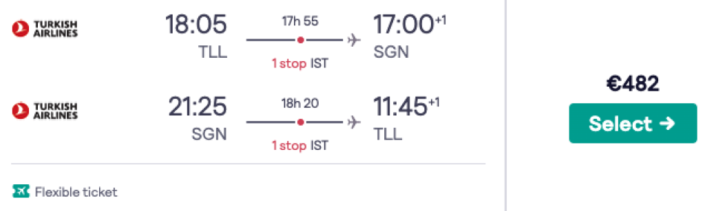Turkish Airlines pakub hetkel atraktiivse hinnaga lennupileteid talveks Tallinnast Vietnami. Mõlemal suunal ühe kiire ümberistumisega lennupiletid Tallinnast Ho Chi Minh Citysse on saadaval 482€ eest. Lennupiletite hinna sees on nii äraantav pagas kui toitlustamine Turkish Airlinesi pardal. Saadavust leiab alates septembri algusest kuni 2021 maini välja. Toome allpool välja näidiskuupäevad alates novembrist ja saadavust leiab ka teistel kuupäevadel. Parima hinnaga lennupiletid leiad üles läbi Skyscanneri