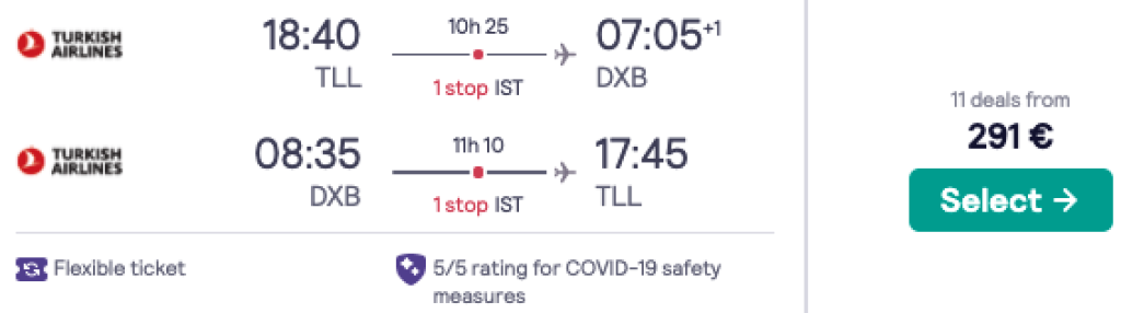 Turkish Airlines pakub hetkel hea hinnaga lennupileteid Dubaisse. Kiirete ümberistumistega edasi-tagasi lennupiletid Tallinnast Dubaisse on saadaval alates 291€ eest ning saadavus on suurepärane alates septembrist kuni 2022 aasta kevadeni (välja arvatud jõulude-aastavahetuse aeg). Turkish Airlinesi lennupiletite puhul on lennupiletite hinnas ka lisaks toitlustamisele 30kg äraantavat pagasit. Lennupiletite ostmiseks kliki allpool olevatel näidiskuupäevadel või otsi endale sobivad lennupiletid üles läbi Skyscanneri