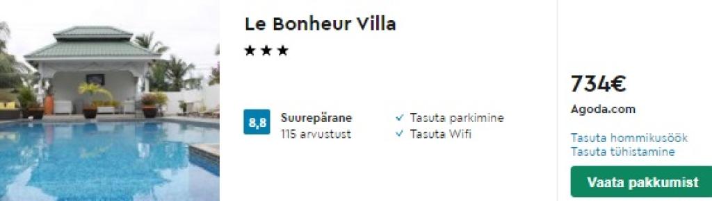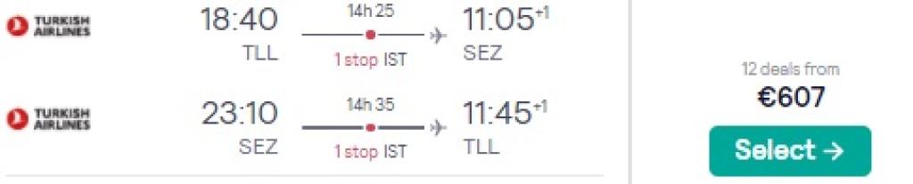 Hetkel leiad väga hea hinnaga mugavad lennud sügiseks ja talveks Turkish Airlinesiga Tallinnast Seišellidele. Edasi-tagasi lennupiletid on saadaval alates 607€ eest ning lennupiletite saadavus on hea novembrist kuni märtsini. Lennud mõlemal suunal ühe mugava ümberistumisega Istanbulis. Piletiteni jõudmiseks kliki allpool olevatel näidiskuupäevadel või kontrolli endale sobivaid lennukuupäevi läbi Skyscanneri.
