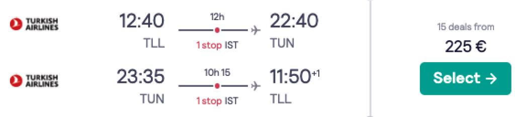 Turkish Airlines pakub hetkel suurepärase hinnaga lennupileteid Tuneesiasse. Edasi-tagasi lennupiletid Tallinnast Tunisesse on saadaval alates 225€ eest ning soodsa hinnaga lennupileteid leiab reisimaks septembris ja oktoobris. Tegemist on lendudega, mis on ühe ümberistumisega Istanbulis ning lennupiletite hinnas on ka äraantav pagas (kuni 30kg). Parima hinnaga lennupiletid leiad üles läbi Skyscanneri.