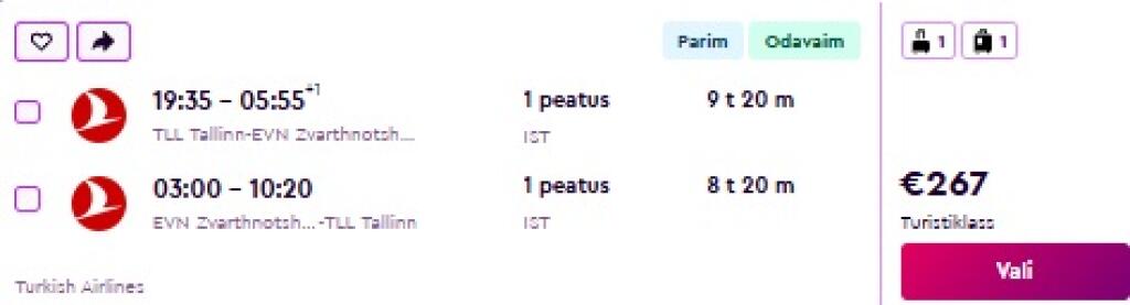Turkish Airlines pakub hetkel soodsa hinnaga lennupileteid Armeeniasse. Edasi-tagasi lennupiletid Tallinnast pealinna Jerevani on saadaval alates 267€ eest ja lendudel on mõlemal suunal üks kiire ümberistumine Istanbulis.