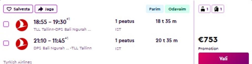 Turkish Airlines pakub hetkel väga hea hinnaga lennupileteid Bali saarele. Edasi-tagasi lennupiletid Tallinnast on saadaval alates 753€ eest. Soodsa hinnaga piletid on saadaval kevadeks ja sügiseks.