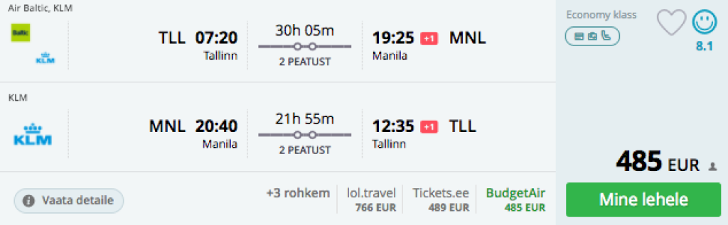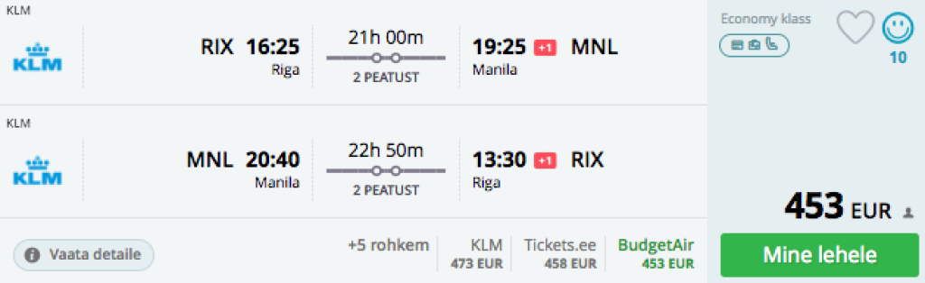 KLM pakub hetkel väga hea hinnaga lennupileteid juba veebruari alguseks Riiast ning Tallinnast Filipiinidele. Soodsaimad edasi-tagasi lennupiletid leiab üles algusega Riiast. Kui soovid lennata Tallinnast siis mainime ära, et kuna ümberistumine on minnes Amsterdamis pikk (12h), siis tuleb päev Amsterdamiga tutvumiseks kulutada. Valikus on ainult variant minemiseks 01.02-12.02 ehk siis 11 ööd kohapeal. Meie soovitus on lennata edasi näiteks Boholile, Palawanile või miks mitte ka Boracayle.