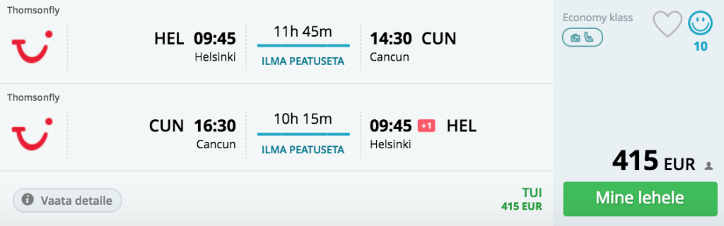 TUI pakub hetkel väga hea hinnaga lennupileteid Helsingist Yukatani poolsaarele asuvasse Cancuni! Edasi-tagasi lennupiletid otselendudele on saadaval vaid 415€ eest. Reisi pikkus on 14 päeva, mille jooksul jõuad huvi korral külastada lisaks Cancunile nii Cancunist lõunas asuvaid Tulumit, Playa del Carmenit, Cozumeli kui Isla Mujerest või Holboxi saart. Ühistransport toimib Yukatani poolsaarel hästi aga mugavaim variant on rentida auto ning parima hinnaga autod leiad üles läbi Rentalcars.com