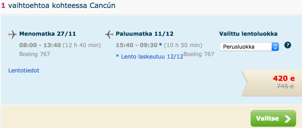 Soome reisikorraldaja Finnmatkat pakub hetkel väga soodsaid lennupileteid Helsingist Yukatani poolsaarele, Cancuni. Edasi- tagasi hinnad al 420€. Soodsaid variante leiad novembris. Tegemist on otselendudega ning lennufirmaks TUIfly Nordic. Kohalolemise aeg on 2 nädalat! Antud lennupiletid leiad aadressil http://www.finnmatkat.fi/hae-matka .