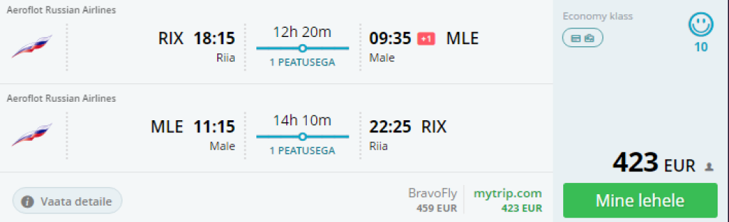 Aeroflot pakub hetkel soodsaid edasi-tagasi lennupileteid Riiast Maldiividele hinnaga alates 423€. Saadavus novembri algusest detsembri esimese pooleni. Lennud ühe kiire ümberistumisega Moskvas mõlemal suunal. Soodsaid lennukuupäevi kontrolli momondos või kasuta otselinke allpool.