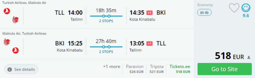 Turkish Airlines koostöös Malaisia lennufirmaga Malindo Air pakub soodsaid lende Tallinnast Borneole, Kota Kinabalusse hinnaga al. 518€. Pileteid leiab alates septembrist kuni maini 2017 (v.a. jõulud ja aastavahetus).