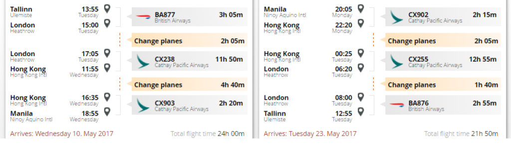 NB: Mõningate piletite puhul pole ümberistumisajad Hongkongis piisavad. Pisut otsides leidub ka optimaalsete aegadega variante!