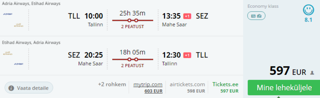 Etihad pakub hetkel soodsaid lennupileteid Tallinnast Seišellidele, edasi- tagasi lennupiletite hinnad alates 597€. Saadavus oktoobrist aprillini. Soodsaid lennukuupäevi otsi läbi momondo või kasuta otselinke allpool.