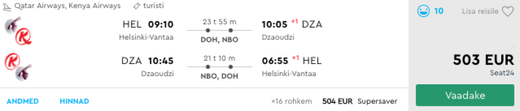 Qatar Airways koostöös Kenyan Airwaysiga pakuvad hetkel väga hea hinnaga lennupiletid Prantsusmaale kuuluvale Mayotte'ile. Edasi-tagasi lennupiletid Helsingist Dzaoudzisse on saadaval alates 503€ eest. Soodsa hinnaga lennupileteid leiab alates veebruari lõpust kuni juuli alguseni ning septembri algusest kuni detsembri keskpaigani. Lennud on mõlemal suunal kahe ümberistumisega (Dohas ja Nairobis). Lennupiletite hinna sees on nii äraantav pagas kui toitlustamine pardal. Lennud Helsingist tuleb teha teisipäeviti ning tagasilennuks valida kas reede või esmaspäev. Lennupiletite ostmiseks kliki allpool olevatel näidiskuupäevadel või otsi need ise läbi läbi Momondo.ee