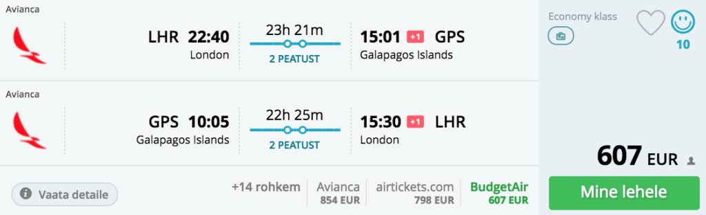 Avianca pakub hetkel väga hea hinnaga lennupileteid algusega Londonist Galapagose saartele! Soodsaimad edasi-tagasi lennupiletid Londonist Galapagosele on saadaval vaid 607€ eest. Soodsaima hinna puhul tuleb veeta päev Bogotas ning öö Ecuadori pealinnas Quitos. Leidub ka kiirete ümberistumistega lende, mis on vaid mõnevõrra kallimad. Soodsa hinnaga lennupileteid leiab märtsist kuni juuni keskpaigani.
