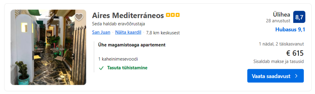 Tasuta tühistamisvõimalusega apartment kahele selles kaasaegses majutuses maksab 7 ööks kokku 615€ ehk 308€/per person. Lisainfo ja broneerimine.