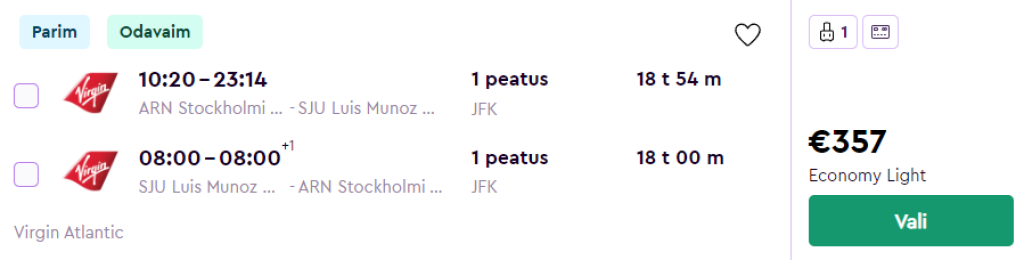 Hetkel leiab suurepärase hinnaga lennupileteid Kariibidele, Puerto Ricosse. Edasi-tagasi lennupiletid Stockholmist pealinna San Juan`i on saadaval alates 357€ eest reisimiseks septembrist veebruarini 2024. Allpool väljatoodud lennud on ühe või kahe ümberistumisega, nii kiirete kui ka pikema päevase ümberistumisega (6h) New Yorgis, mis annab ühtlasi hea võimaluse selle linnaga tutvumiseks. Soodsaid lennupileteid pakuvad nii Oneworldi, Skyteami kui ka Star Alliance'i lennufirmad. Lennupiletititeni jõudmiseks kliki allolevatel näidiskuupäevadel või kontrolli endale sobivaid kuupäevi läbi Momondo.ee