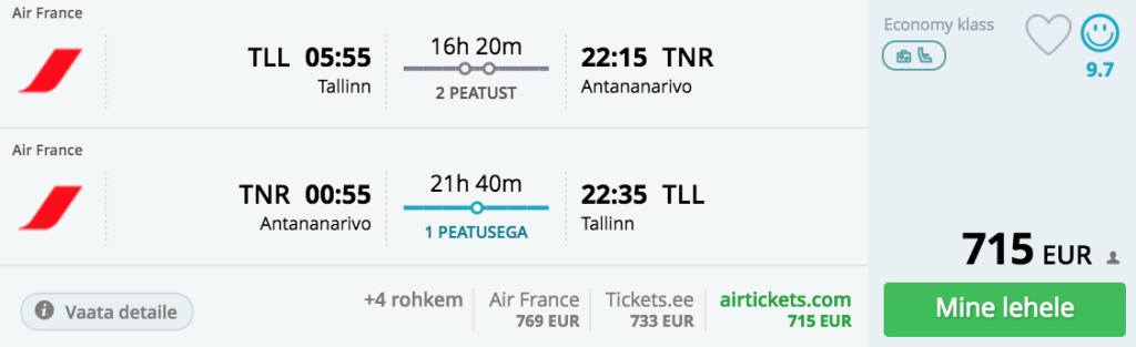 Skyteami lennufirmad Air France ning KLM koostöös airbalticuga pakuvad hetkel väga hea hinnaga lennupileteid eksootilisele Madagaskari saarele. Edasi-tagasi lennupiletid Tallinnast Antananarivosse on saadaval 715€ eest ning saadavust leiab märtsist kuni juuli alguseni ning alates augustist kuni novembri alguseni. Lendudel on olenevalt kuupäevadest ümberistumised kas Riias ning Pariisis. Tagasiteel on enamjaolt 6-7h pikkune ümberistumine Pariisis. Parima hinnaga lennupiletid leiad üles läbi Momondo.ee