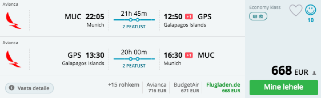Avianca pakub hetkel väga hea hinnaga lennupileteid algusega Münchenist Galapagose saartele. Soodsaimad edasi-tagasi lennupiletid Münchenist Galapagosele on saadaval vaid 668€ eest. Soodsa hinnaga lennupileteid leiab alates novembrist kuni märtsi lõpuni välja. Lendudel on kaks ümberistumist, Bogotas ning Quayaquilis. Kõikidel meie poolt välja otsitud lendudel on olemas kiired ümberistumised. Põnevam variant on külastamaks lisaks Galapagose saartele ka mandri Ecuadori. Allpool on ka mõned näidiskuupäevad veetmaks puhkus nii Galapagosel kui Ecuadoris. Avianca lennupiletite hinna sees on nii toitlustamine pardal kui äraantav pagas.