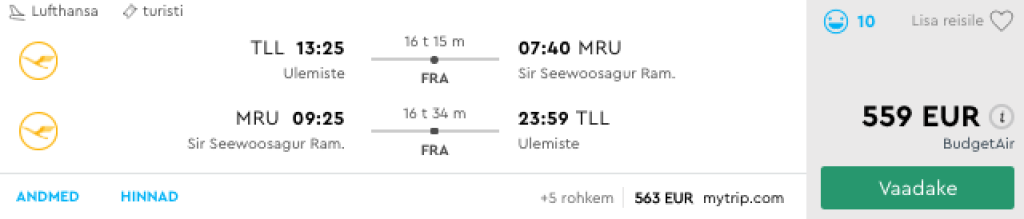 Euroopa parim lennufirma Lufthansa pakub hetkel väga hea hinnaga lennupileteid sügisel ja talvel Tallinnast India ookeanis asuvale Mauritiuse saarele. Edasi-tagasi lennupiletid on saadaval alates 559€ eest. Alla 600€ lennupileteid leiab alates novembri keskpaigast kuni aprilli keskpaigani. Tutvu saadaolevate lennukuupäevadega allpool või kontrolli endale sobivaid läbi Momondo.ee