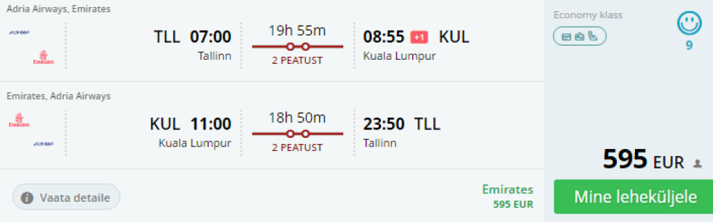 2016. aastal maailma parimaks lennufirmaks valitud Emirates koostöös Adriaga pakub mugavaid lende Tallinnast Kuala Lumpurisse hinnaga 595€. Lennud on kahe kiire ümberistumisega Münchenis ja Dubais.